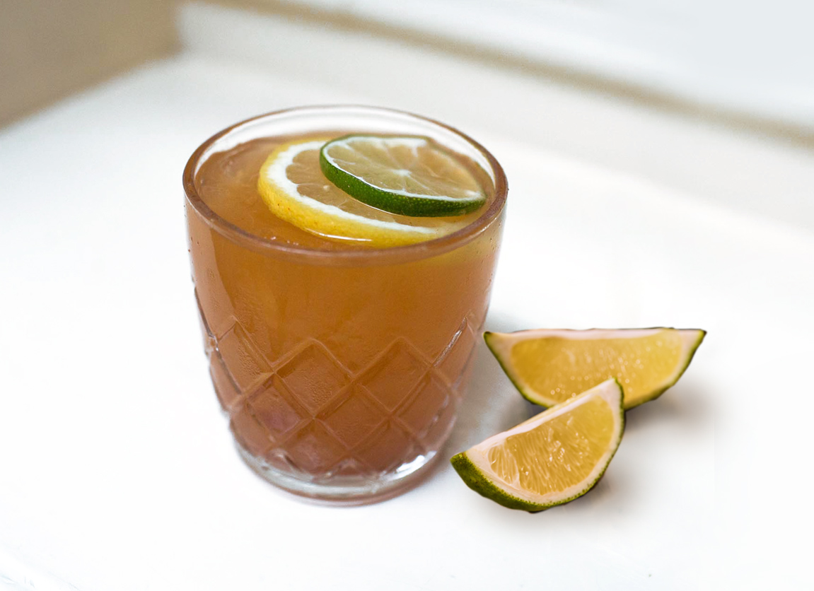 Muddle ginger, add remaining ingredients. Shake well.
